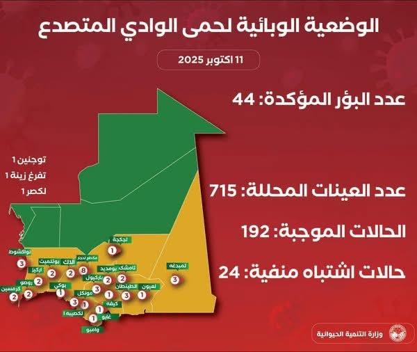 ارتفاع بؤر حمى الوادي المتصدع إلى 44 بؤرة موزعة على 22 مقاطعةارتفعت بؤر حمى الوادي المتصدع في موريتانيا إلى 44 بؤرة موزعة على22 مقاطعة تتبع لعشر ولايات.