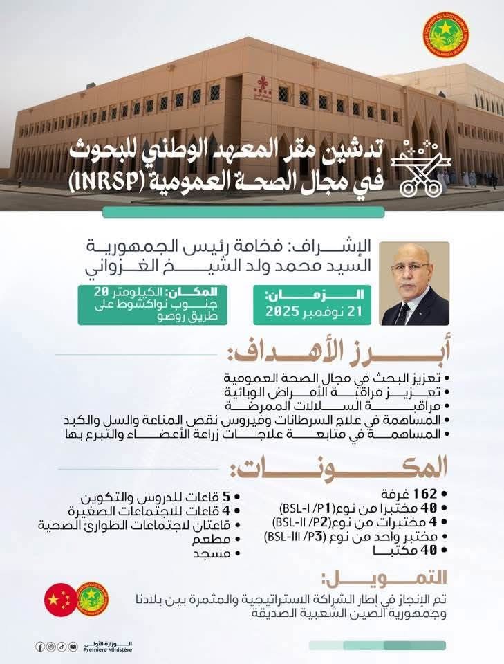 أشرف رئيس الجمهورية، السيد محمد ولد الشيخ الغزواني، اليوم الجمعة في بلدية العرية بولاية اترارزة، على حفل تدشين المعهد الوطني للبحوث في مجال الصحة العمومية.