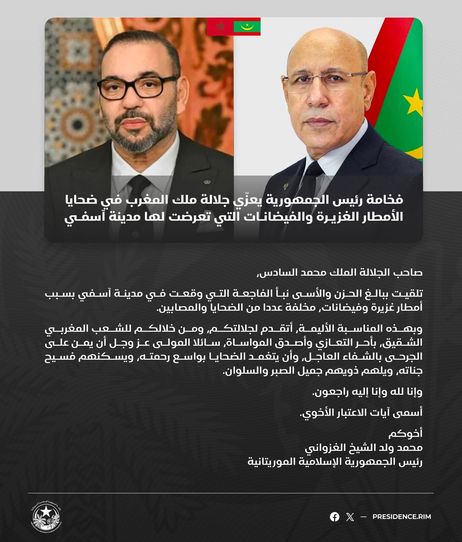 بعث رئيس الجمهورية، محمد ولد الشيخ الغزواني، برقية تعزية إلى ملك المملكة المغربية، محمد السادس، على إثر الأمطار الغزيرة والفيضانات التي تعرضت لها مدينة آسفي، وما خلفته من خسائر في الأرواح والممتلكات.