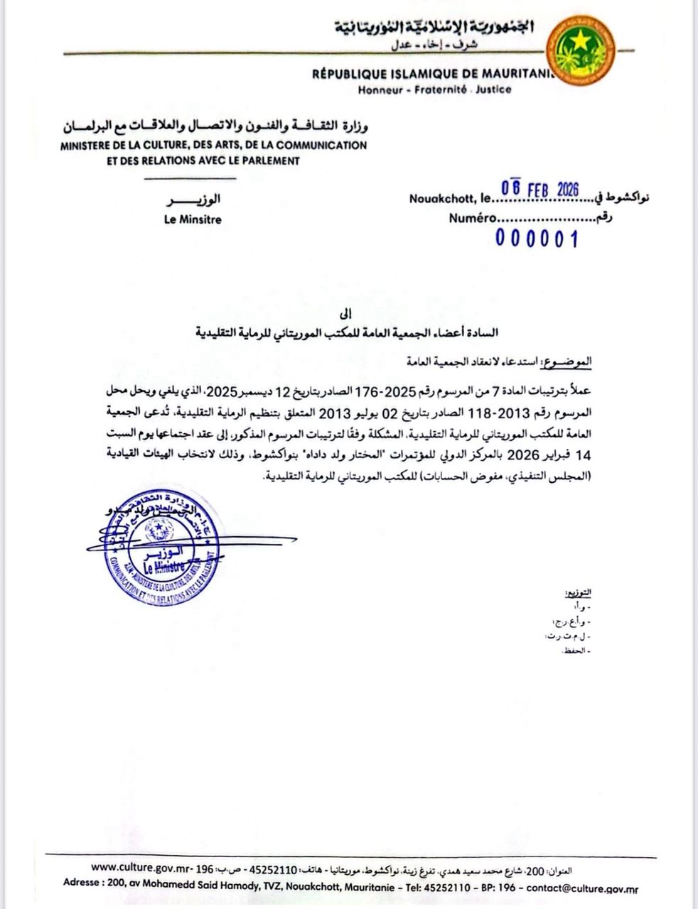 وجهت وزارة الثقافة والفنون والاتصال والعلاقات مع البرلمان اليوم الجمعة دعوة للجمعية العامة للمكتب الموريتاني للرماية التقليدية، وذلك من أجل عقد الجمعية العامة لانتخاب هيئاته القيادية.